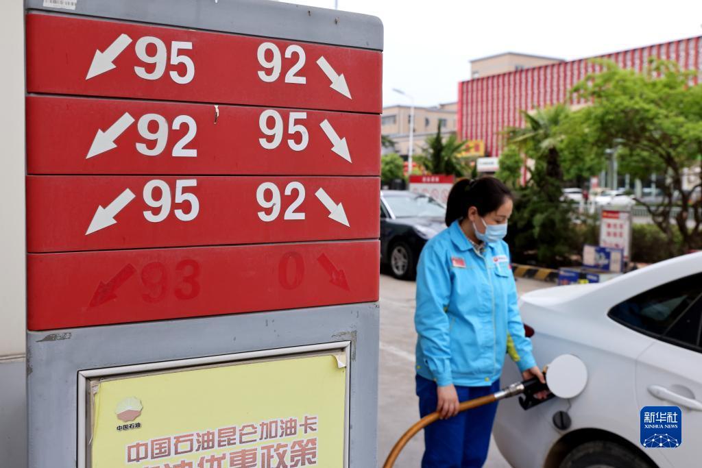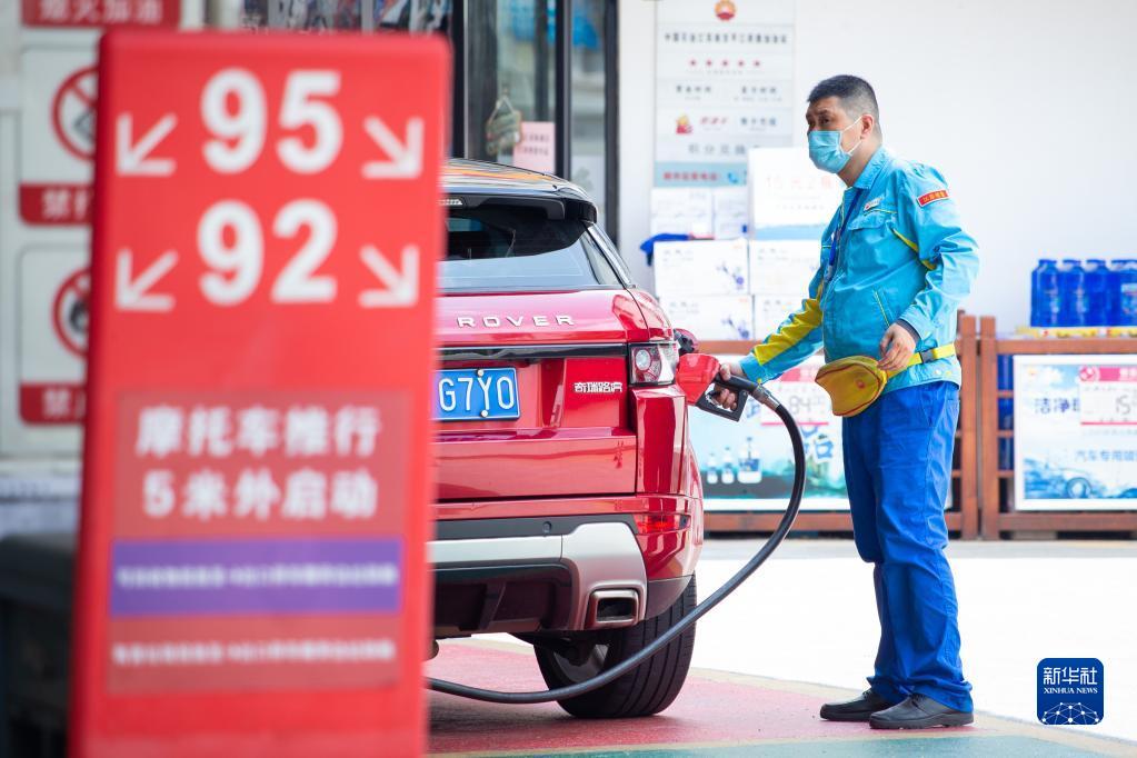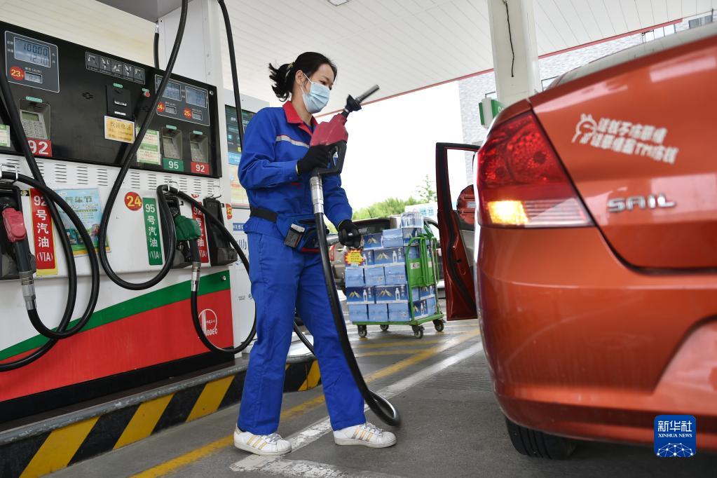 4月28日,河北省石家庄新乐市一家加油站的工作人员给车辆加油。