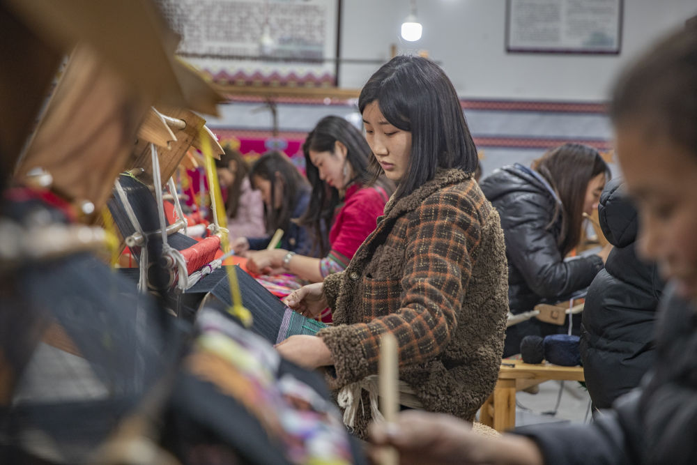 在西兰卡普非遗工坊,返乡“90后”李蔓正仔细编织着西兰卡普织锦。李蔓说,公司为每个员工都购买了社会保险,每月基本工资有2000多元。除了做织工,她还负责工坊产品的电商销售工作。