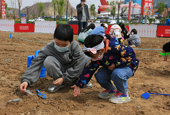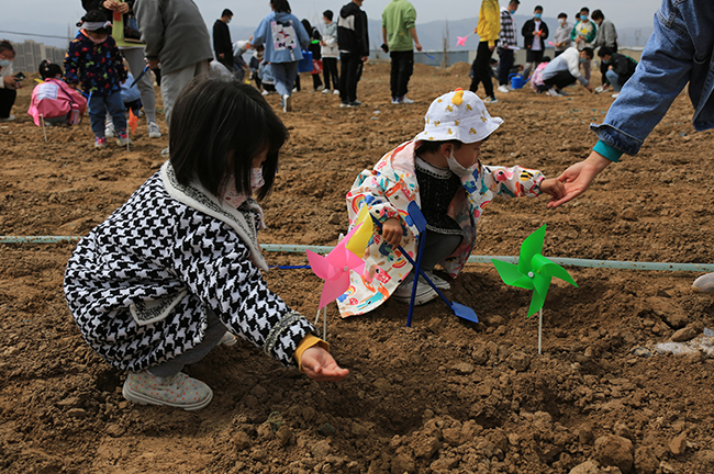 参加活动的少年儿童和家长一起种植向日葵。 贾笑云 摄