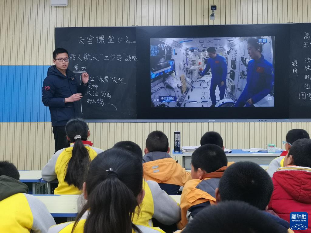 3月23日,唐信与陕西省合阳县坊镇中心小学的学生一起观摩“天宫课堂”。新华社发(受访者供图)