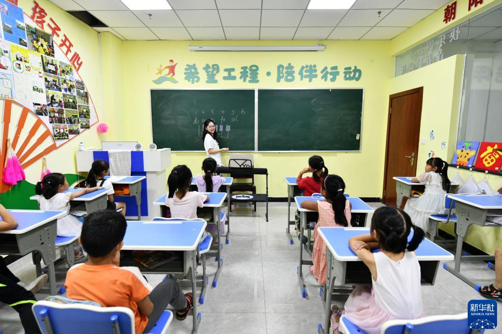 在贵州省思南县双塘街道丽景社区易地扶贫搬迁安置点,大学生志愿者给孩子们上音乐课(2020年8月13日摄)。新华社记者杨文斌摄