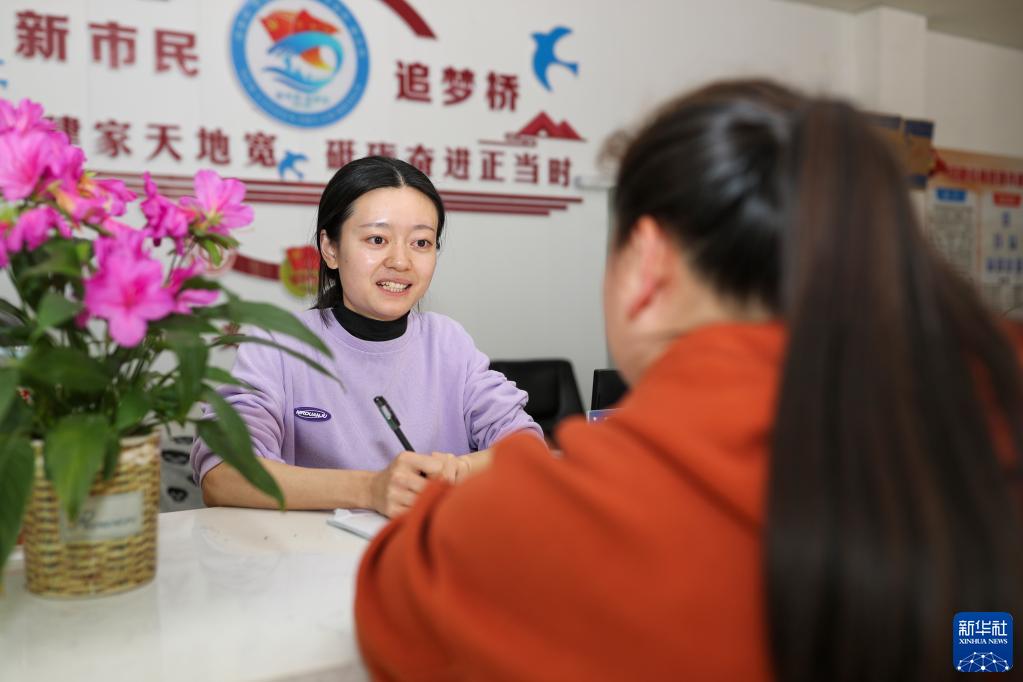 5月1日,西部计划志愿者车佳桃(左)在贵州省铜仁市玉屏侗族自治县新店镇丙溪村活动室接待村民咨询产业发展问题。新华社发(胡攀学摄)