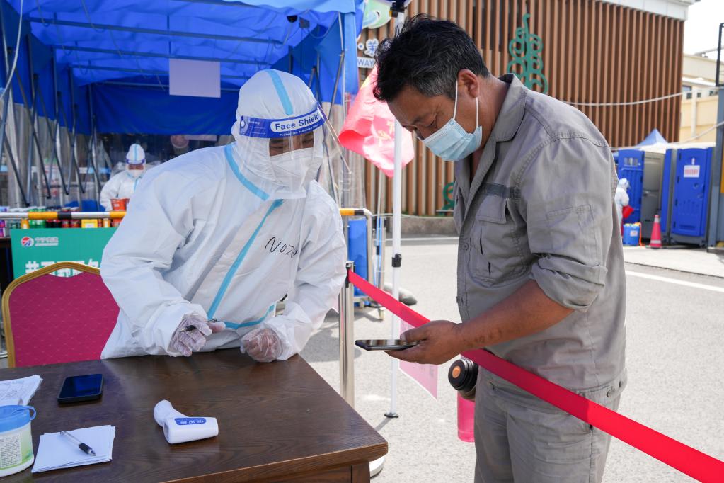 4月22日,在沪宁高速黄栗墅服务区,工作人员在查验一位货车司机的健康码。新华社记者李博摄