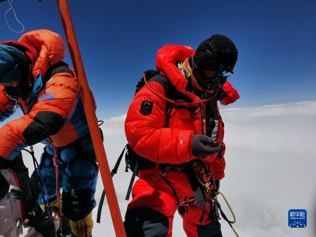 5月4日,科考队员登上珠穆朗玛峰峰顶。新华社特约记者索朗多吉摄