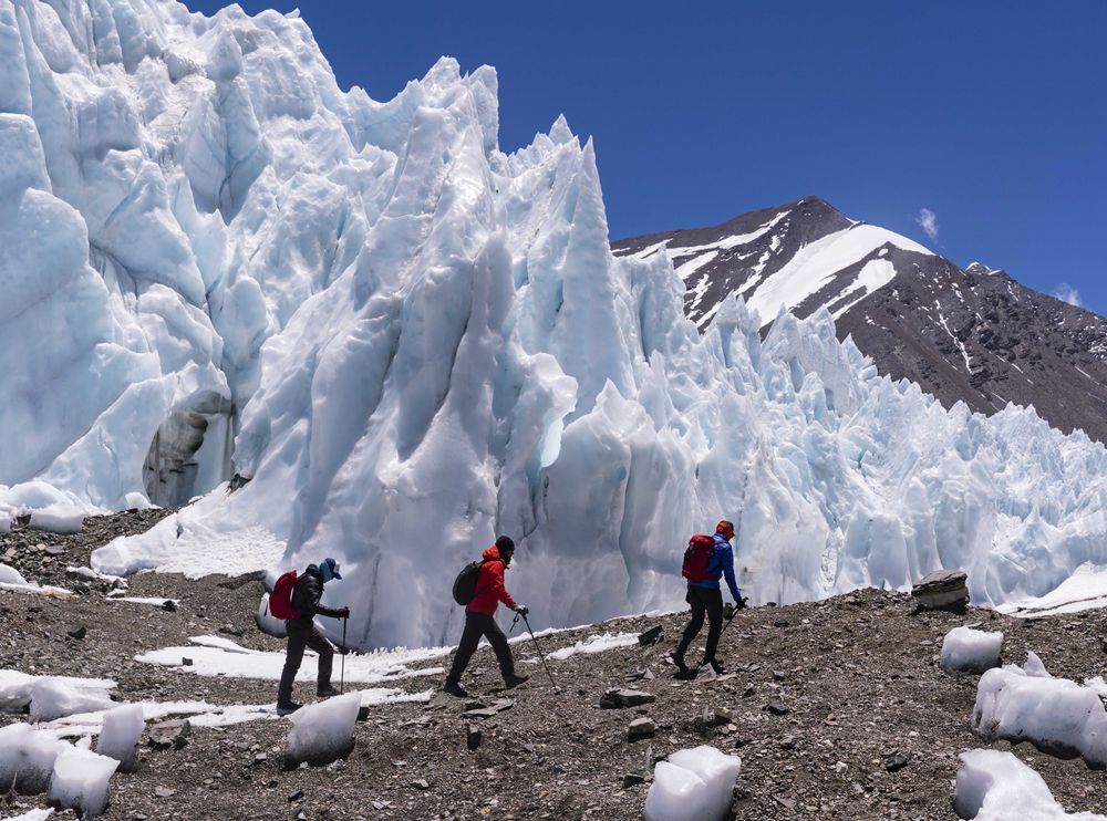 ↑德庆欧珠(右一)在珠峰海拔6000米左右的绒布冰川冰塔林间徒步(2019年5月21日摄)。