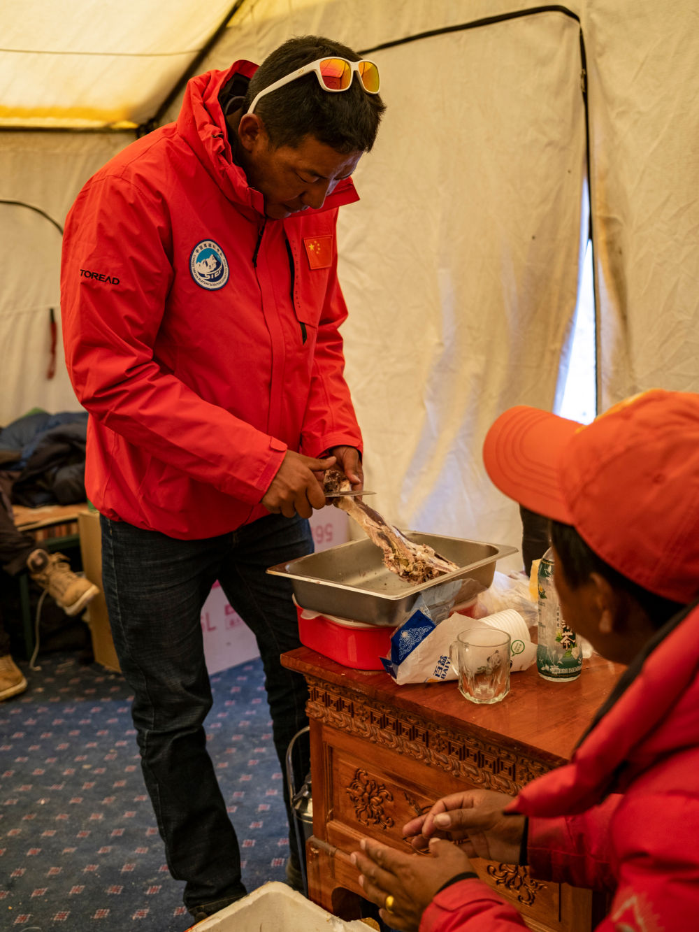 ↑德庆欧珠(左)在珠峰大本营内削肉吃(5月7日摄)。