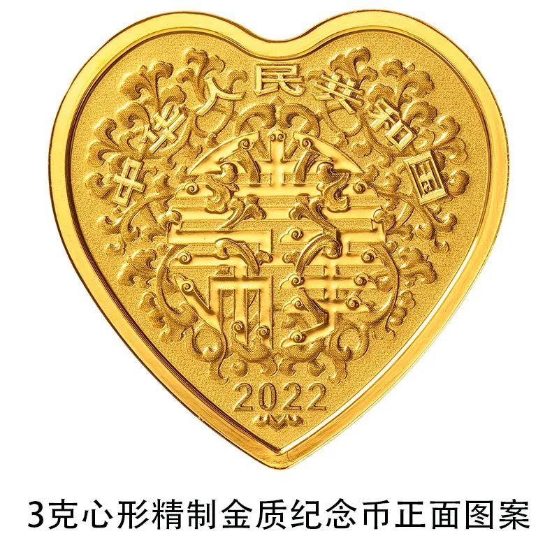 3克心形金质纪念币为精制币,含纯金3克,外接正方形边长18毫米,面额50元,成色99.9%,最大发行量20000枚。