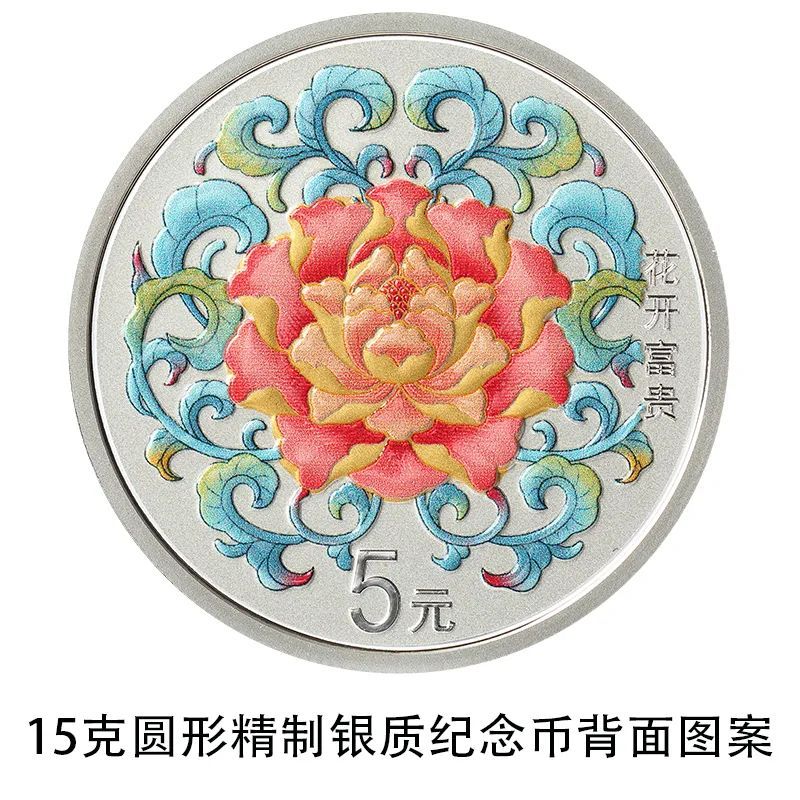 15克圆形银质“花开富贵”纪念币背面图案为牡丹、缠枝纹装饰组合图案,并刊“花开富贵”字样及面额。