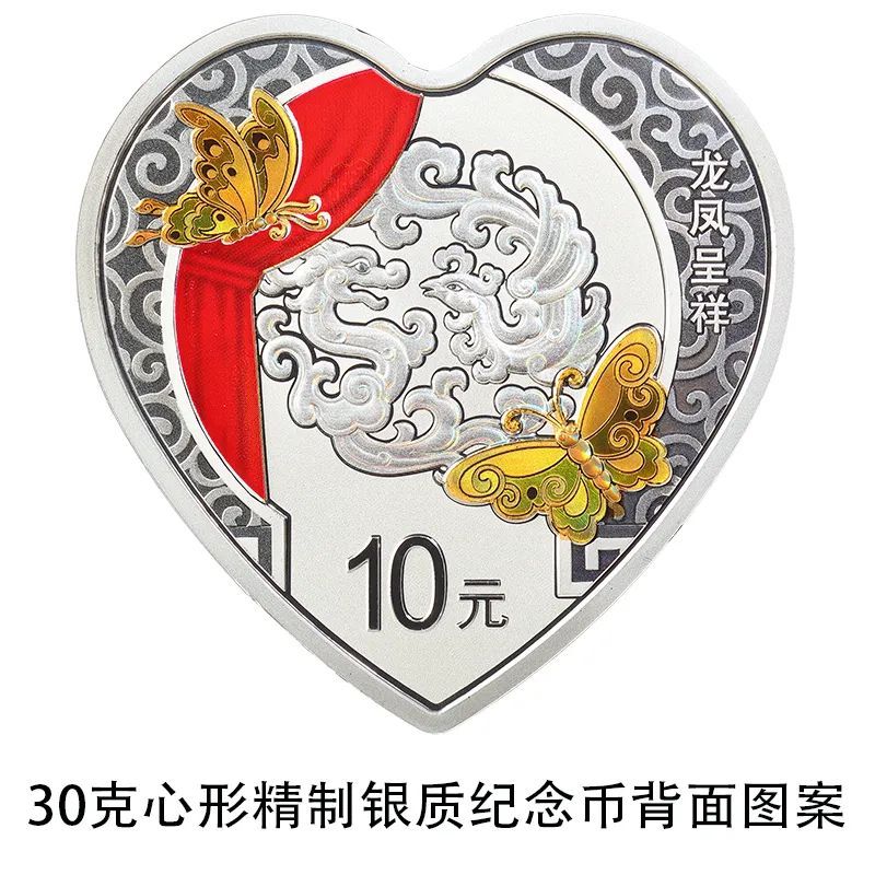 30克心形银质“龙凤呈祥”纪念币背面图案为蝴蝶、龙、凤、圆光罩、帘子等装饰组合图案,并刊“龙凤呈祥”字样及面额。
