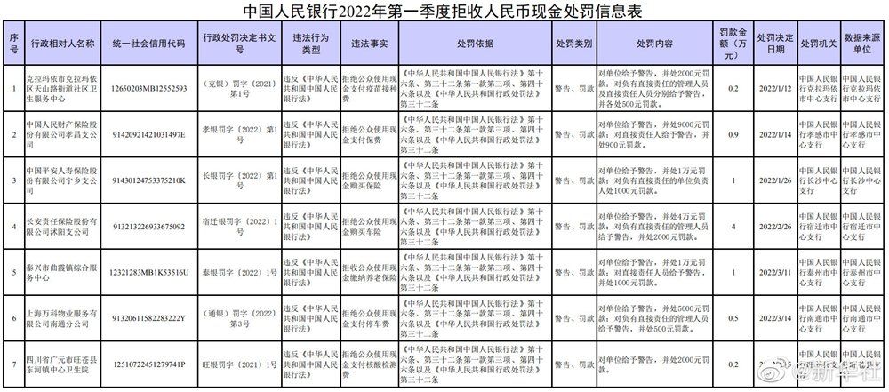 中国人民银行13日对外公布,2022年第一季度,人民银行依法对长安责任保险股份有限公司沭阳支公司等7家拒收现金的单位及相关责任人作出经济处罚,处罚金额从2000元至4万元人民币不等。