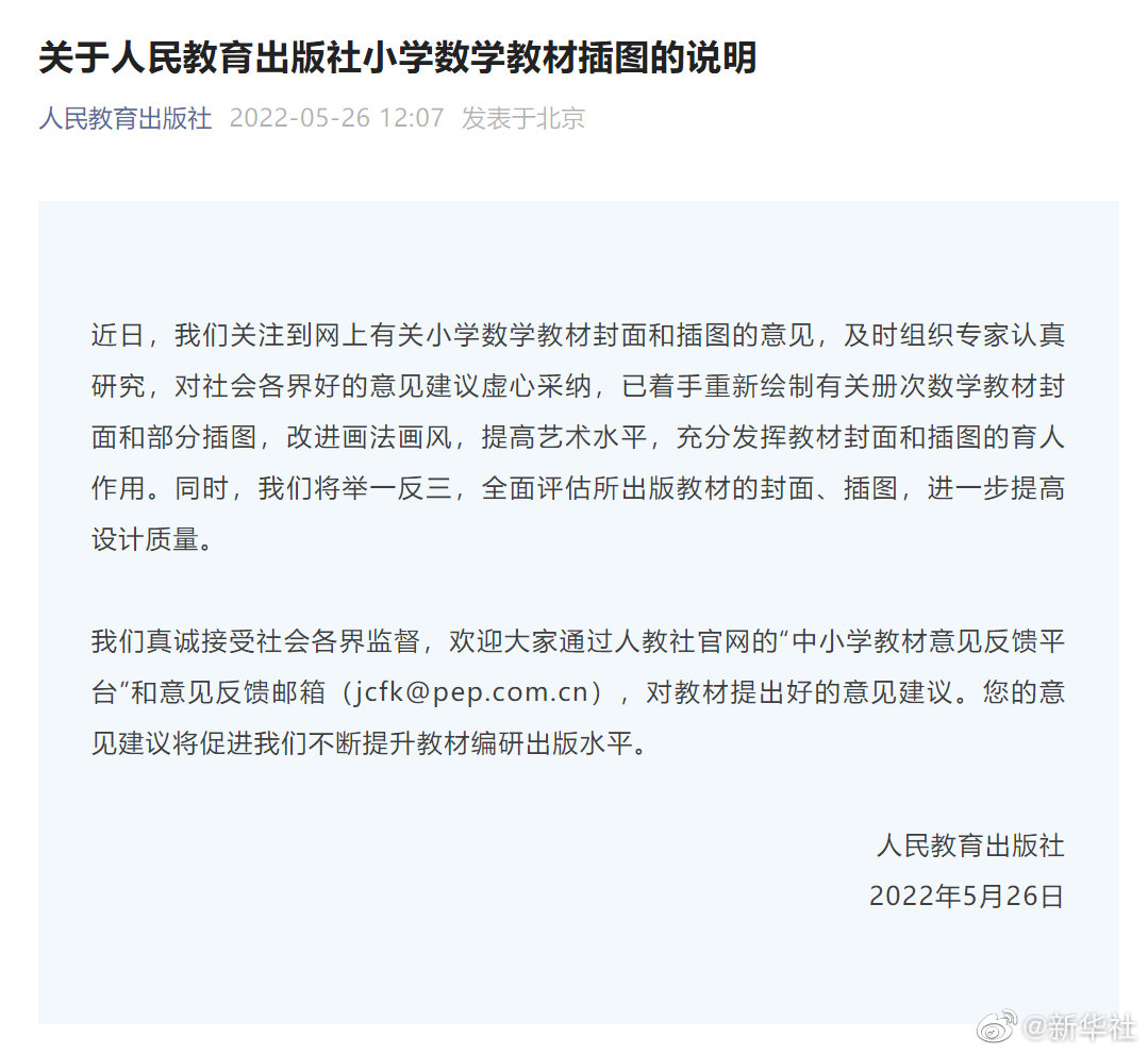 人民教育出版社微博发布《关于人民教育出版社小学数学教材插图的说明》:近日,我们关注到网上有关小学数学教材封面和插图的意见,及时组织专家认真研究,对社会各界好的意见建议虚心采纳,已着手重新绘制有关册次数学教材封面和部分插图,改进画法画风,提高艺术水平,充分发挥教材封面和插图的育人作用。同时,我们将举一反三,全面评估所出版教材的封面、插图,进一步提高设计质量。