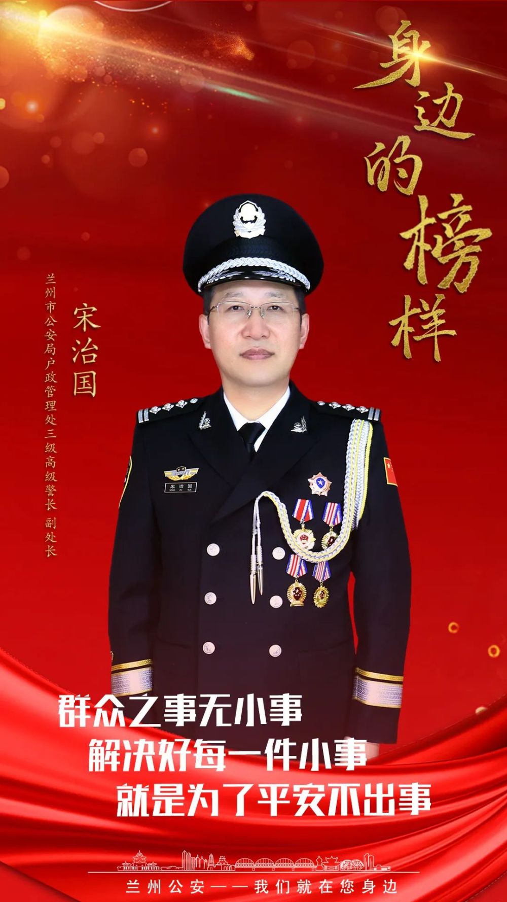 宋治国,现任兰州市公安局户政管理处副处长。19载从警征程中,5年刑警生涯,长期担任派出所副所长、所长。据不完全统计,他参与侦办各类案件1600余起,破获命案16起,抓获吸毒人员1000余人,调解矛盾纠纷1400余起,打击处理各类违法犯罪人员1800余人。