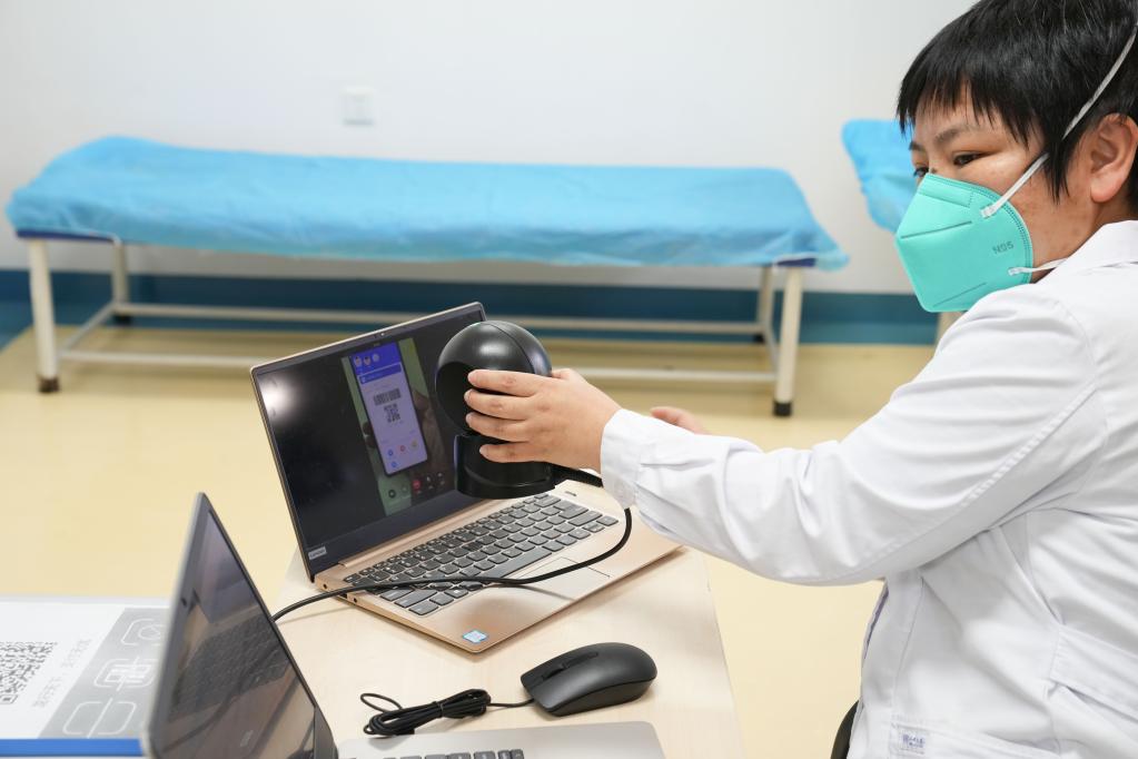 5月22日,在北京市丰台区卢沟桥社区卫生服务中心,医务工作者通过视频连线的方式为预约上门治疗的患者扫描电子医保卡。(新华社记者鞠焕宗摄)