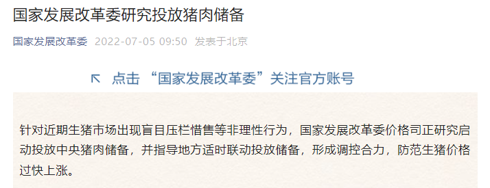 针对近期生猪市场出现盲目压栏惜售等非理性行为,国家发展改革委价格司正研究启动投放中央猪肉储备,并指导地方适时联动投放储备,形成调控合力,防范生猪价格过快上涨。