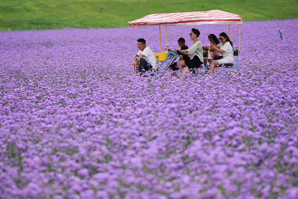 游客在兰州新区临港花海游玩(8月10日摄)。新华社记者陈斌摄