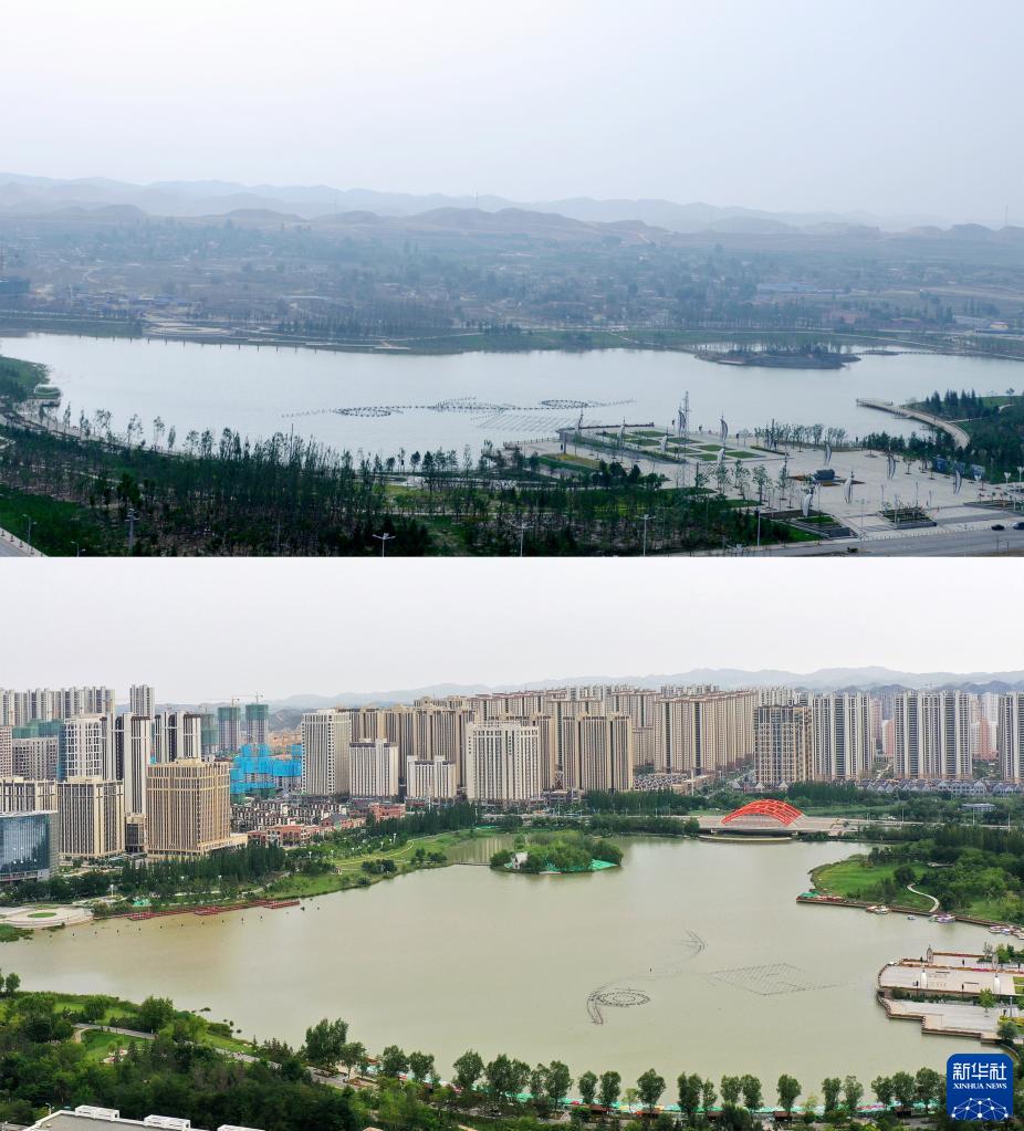 拼版照片:上图刚刚建成蓄水的兰州新区栖霞湖风光(2013年8月22日摄,兰州新区供图);下图为2022年8月10日拍摄的兰州新区栖霞湖风光(无人机照片,新华社记者陈斌摄)。新华社发