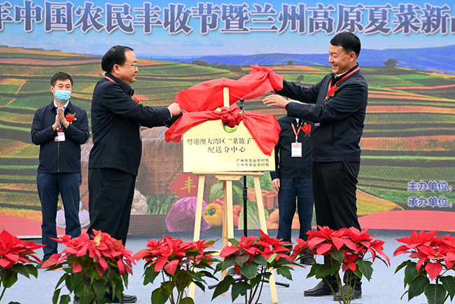 9月23日,在兰州市2022年中国农民丰收节暨兰州高原夏菜新品博览会开幕式上,由兰州市农业农村局和广州市农业农村局共同打造的“粤港澳大湾区‘菜篮子’产品配送分中心”正式揭牌。新华社记者范培珅摄