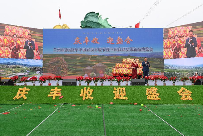 这是9月23日在榆中县康源现代设施农业示范园区拍摄的兰州市2022年中国农民丰收节暨兰州高原夏菜新品博览会开幕式现场。新华社记者范培珅摄