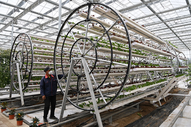 9月23日,在榆中县康源现代设施农业示范园区,工作人员查看旋转式蔬菜种植架上的蔬菜长势。新华社记者范培珅摄