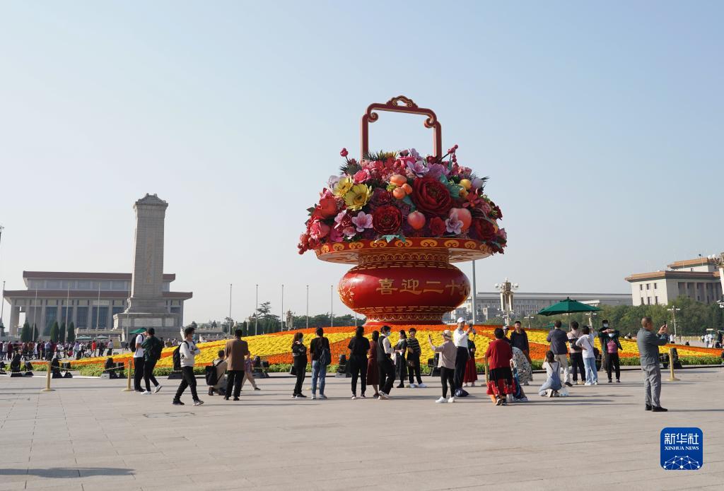 国庆节临近,“祝福祖国”巨型花果篮亮相北京天安门广场。今年“祝福祖国”巨型花果篮顶高18米,以喜庆的花果篮为主景,花坛底部直径48米。