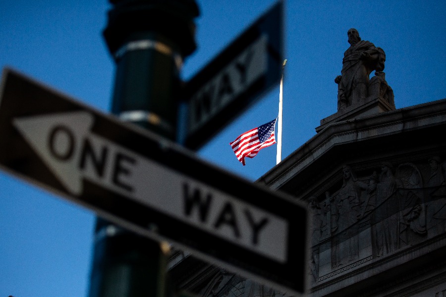 2022年5月12日,美国纽约一座法院降半旗悼念新冠逝者。新华社发(郭克摄)