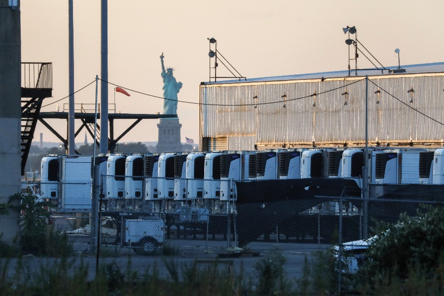 这是2021年9月6日在美国纽约布鲁克林拍摄的一处临时停尸场内存放新冠患者遗体的冷藏车。新华社记者王迎摄
