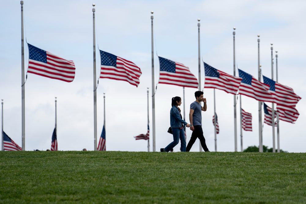 5月12日,在美国华盛顿,华盛顿纪念碑周围的美国国旗降半旗悼念新冠逝者。美国总统拜登当日在白宫网站发表声明说:“今天,我们纪念一个悲剧性里程碑:100万美国人死于新冠。”新华社记者刘杰摄
