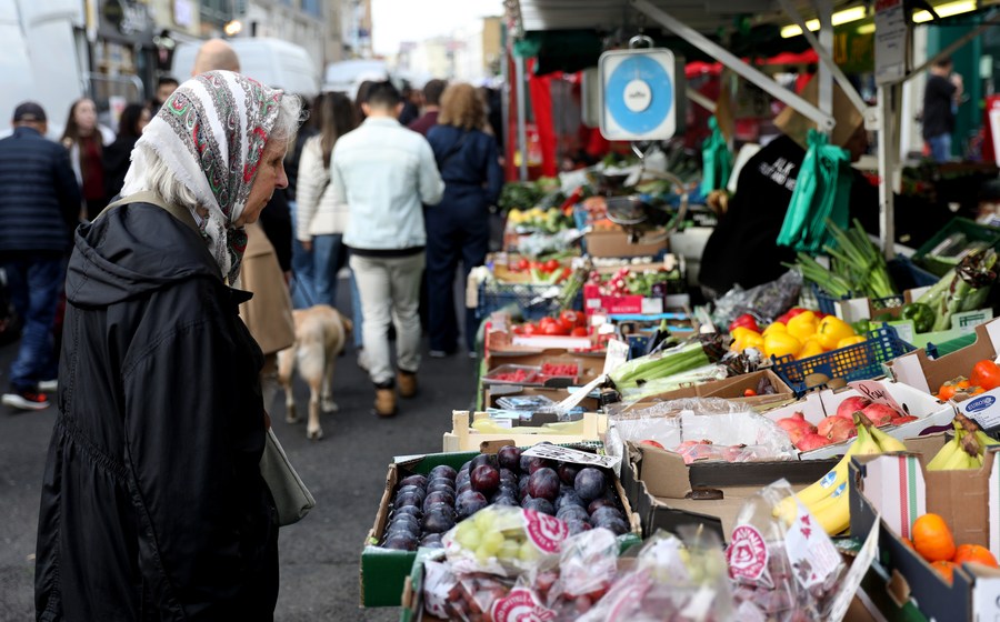 10月22日,一名女子在英国伦敦波托贝洛市场选购蔬果。新华社记者李颖摄