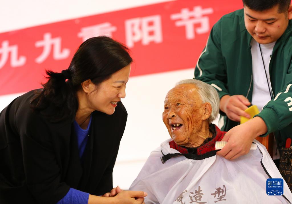 2022年10月4日,在山东省滕州市一家养老院,社会工作者为老人理发。新华社发(李志军摄)
