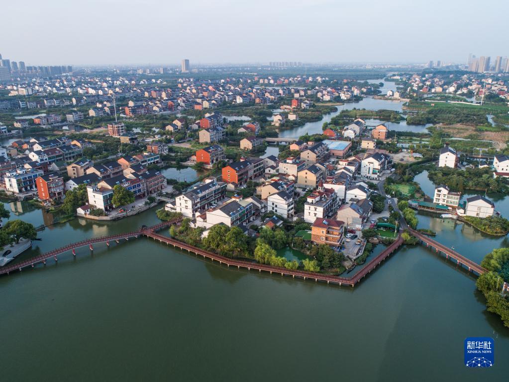空中俯瞰杭州市余杭区塘栖古镇丁山湖边的水上栈道和丁河村(2019年8月7日摄,无人机照片)。新华社记者徐昱摄
