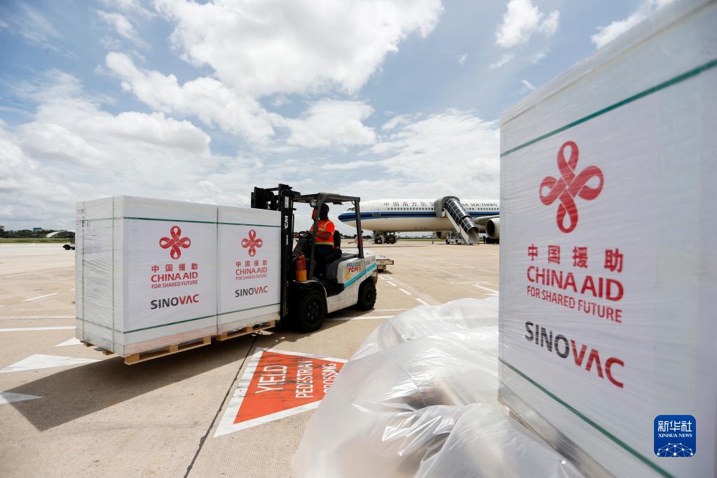 工作人员在柬埔寨金边国际机场运输中国政府援助柬埔寨的科兴新冠疫苗(2021年10月14日摄)。新华社发(批隆摄)