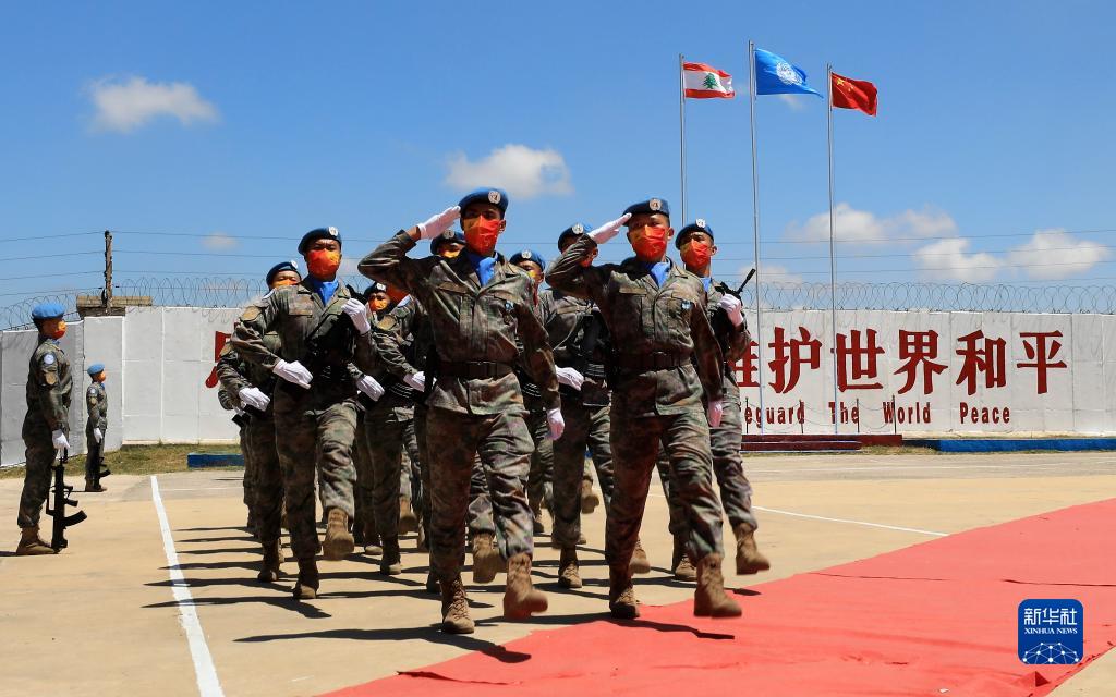 在黎巴嫩南部辛尼亚村的中国维和部队营区,中国维和部队官兵在受勋后通过观礼台(2022年7月1日摄)。新华社记者刘宗亚摄
