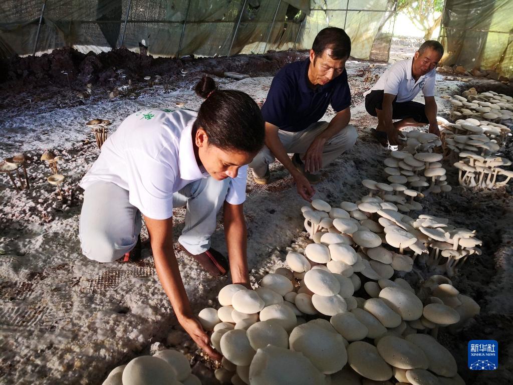 在斐济楠迪,中国专家和当地雇员检查菌菇生长情况(2018年6月12日摄)。新华社记者张永兴摄
