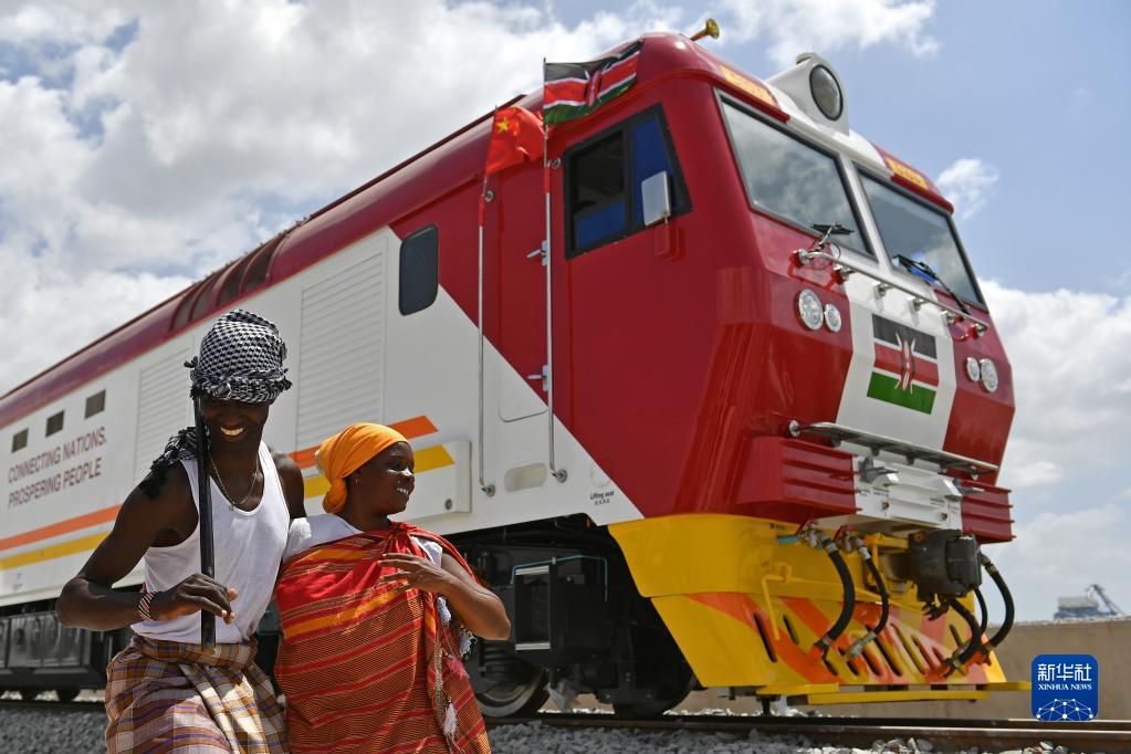 在肯尼亚蒙巴萨,当地民众在中国承制的蒙内铁路首批内燃机车旁载歌载舞(2017年1月11日摄)。新华社记者孙瑞博摄