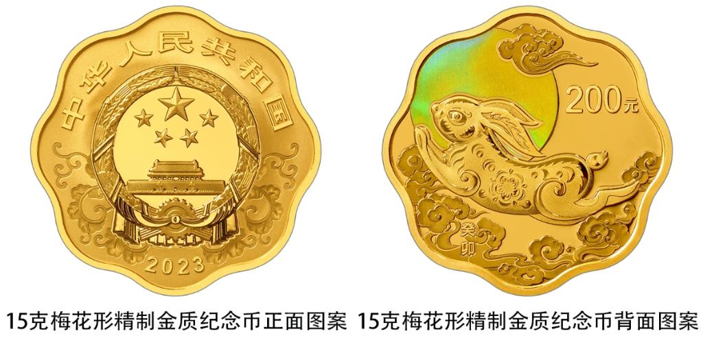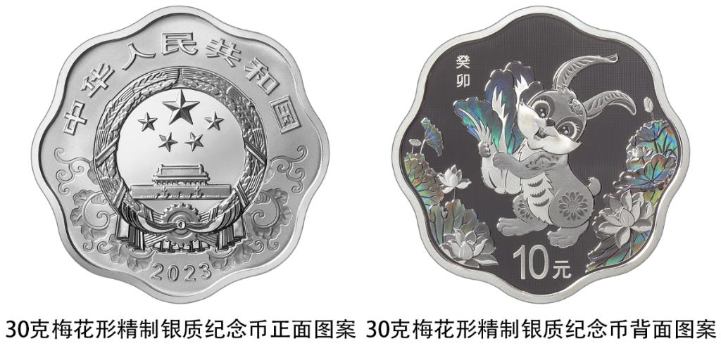 另外,15克梅花形金质纪念币背面图案为剪纸风格兔造型,衬以月亮、祥云组合设计。30克梅花形银质纪念币背面图案为装饰兔及白菜造型,衬以荷花、荷叶等组合设计。
