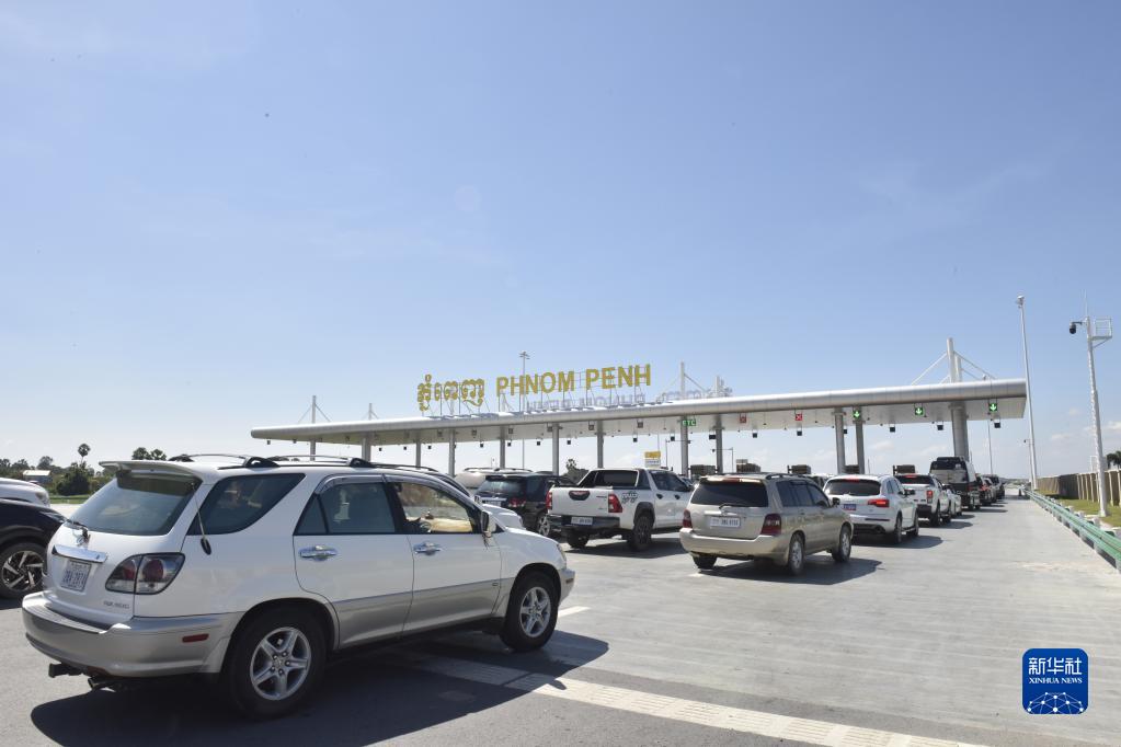 车辆在柬埔寨首都金边的金港高速公路入口处排队(2022年11月7日摄)。新华社记者吴长伟摄