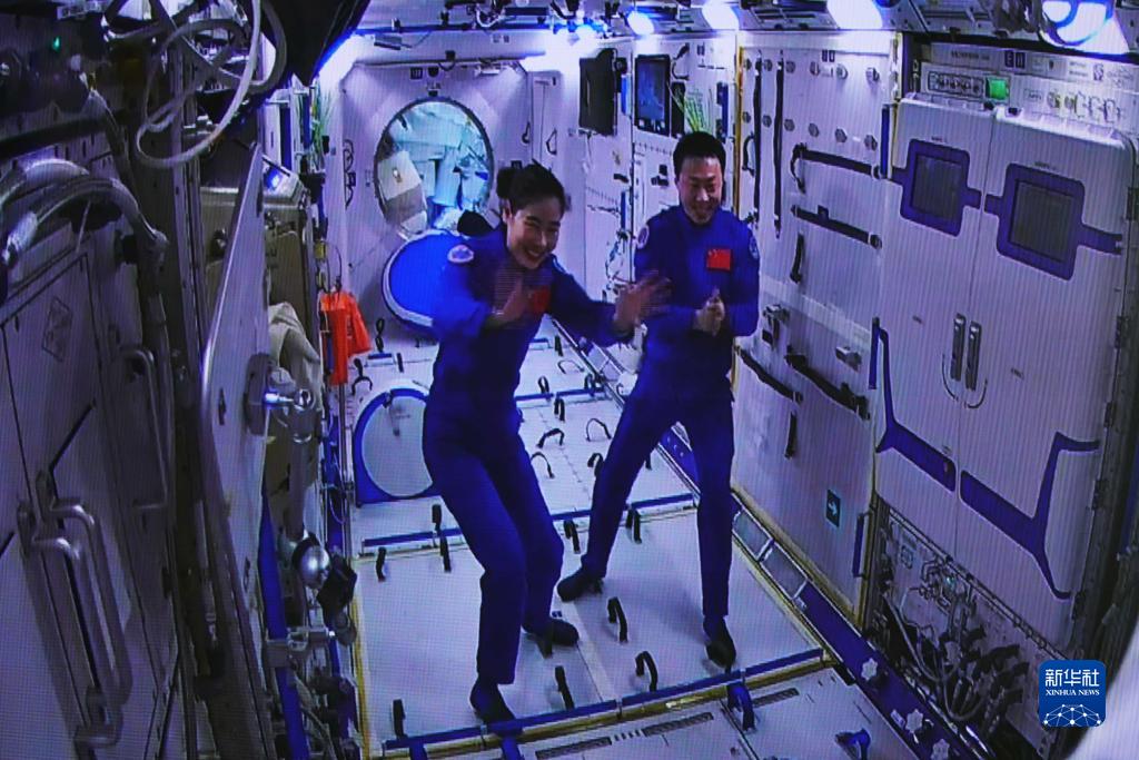 11月30日在酒泉卫星发射中心拍摄的神舟十四号航天员刘洋、蔡旭哲在问天实验舱迎接神舟十五号航天员乘组的画面。