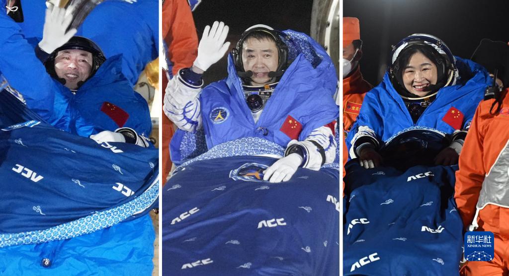 12月4日,神舟十四号载人飞船返回舱在东风着陆场成功着陆。这是航天员陈冬(中)、刘洋(右)、蔡旭哲安全顺利出舱(拼版照片)。新华社发