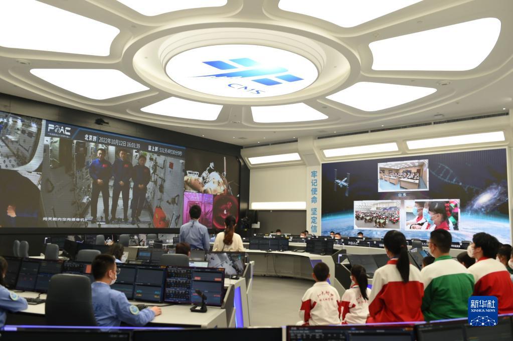 10月12日,在中科院空间应用工程与技术中心地面主课堂,学生收看“天宫课堂”第三课。新华社记者罗晓光摄