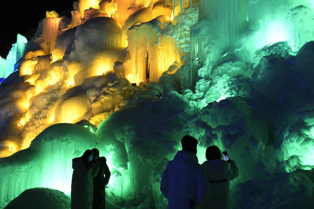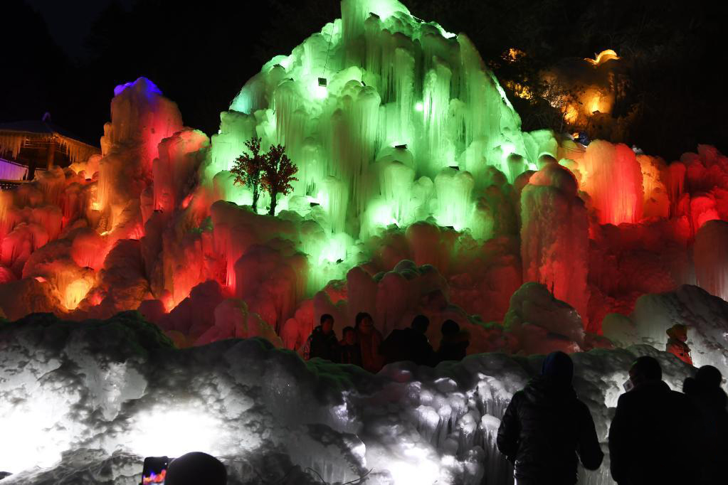 12月25日晚,游客在甘肃省大墩峡景区观赏冰瀑。