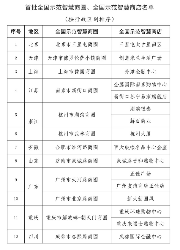商务部1月9日对外公布,经地方培育、自主申报、专家评审和社会公示,商务部近日决定将北京市三里屯商圈等12个商圈和三里屯太古里南区等16个商店确认为“全国示范智慧商圈”和“全国示范智慧商店”,这是商务部公布的首批全国示范智慧商圈、全国示范智慧商店。