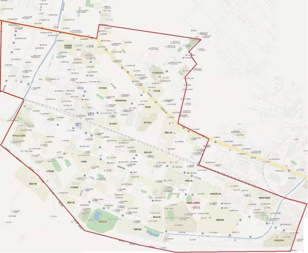 西固区:东至西固东路南部与福利东路交界处、西固中路北部与玉门街(南北向)交界处,南至南山路辅道区域,西至康乐路,北至西固西路至兰州石化公司一线。