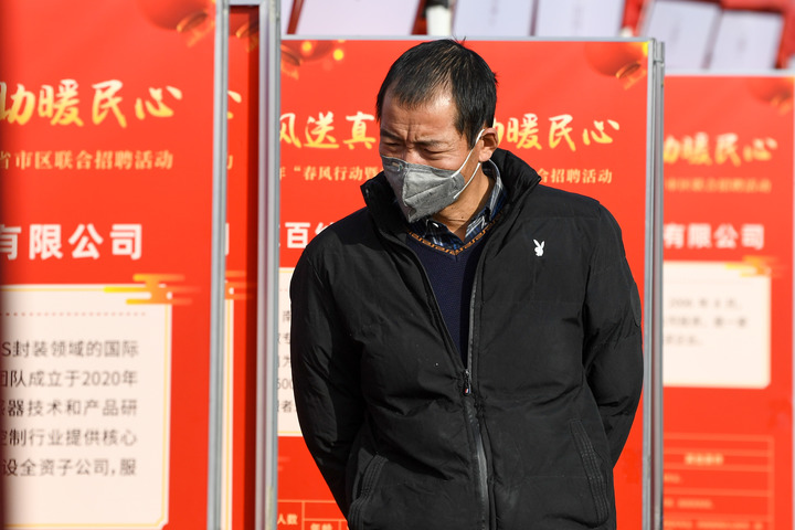 1月11日,2023年“创响江苏”春风行动联合招聘会在南京市浦口区举行。图为一名求职者在招聘会现场查看招聘信息。新华社记者李博摄