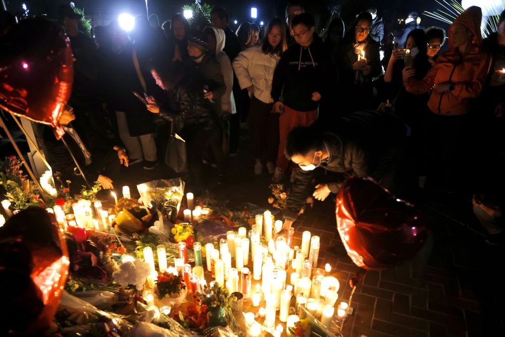 1月23日夜,数百名洛杉矶民众聚集在蒙特雷帕克市政厅前,为枪击事件遇难者举行烛光悼念会。