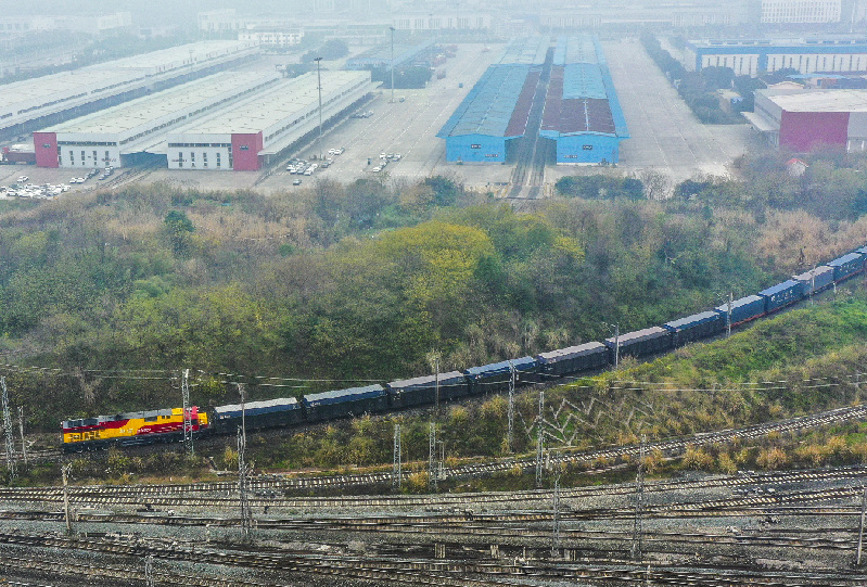 2023年1月22日,农历新年首趟西部陆海新通道铁海联运班列从重庆团结村中心站发车(无人机照片)。新华社记者刘潺摄