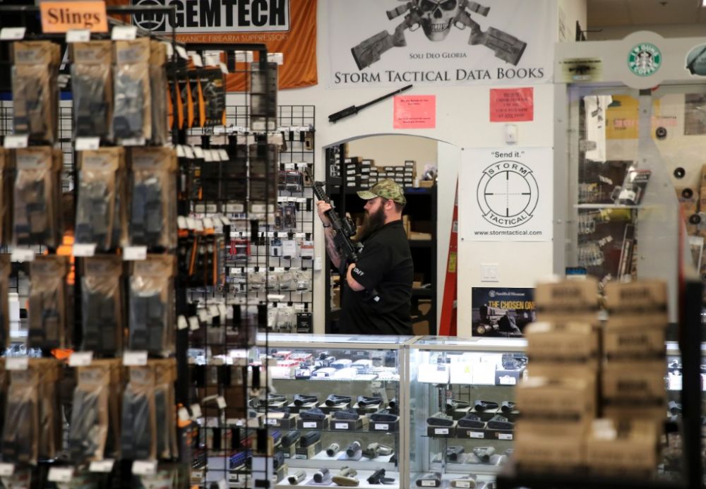 2017年10月4日,在美国拉斯维加斯的“新前线”枪械商店,一名店员为顾客展示枪支。新华社记者王迎摄
