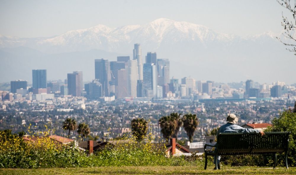2015年3月4日,一名市民在美国洛杉矶肯尼思·哈恩公园远眺洛杉矶市区。新华社记者张超群摄