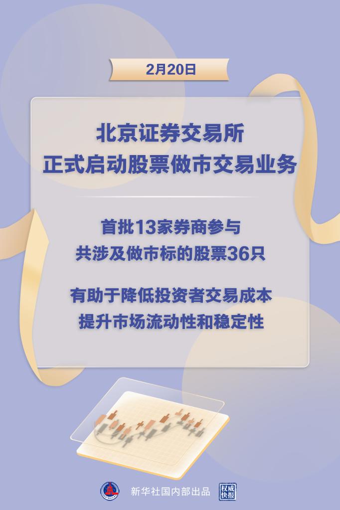2月20日,北京证券交易所正式启动股票做市交易业务。首批13家券商将参与北交所股票做市交易,共涉及做市标的股票36只。