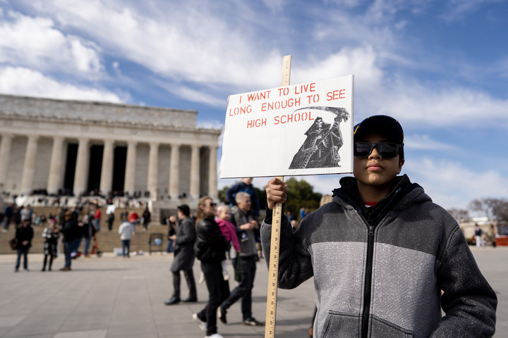 2月19日,在美国首都华盛顿,一名少年参加要求美国停止煽动俄乌冲突的反战集会,手中标语牌上写着“我还想活到上高中”。新华社记者刘杰摄