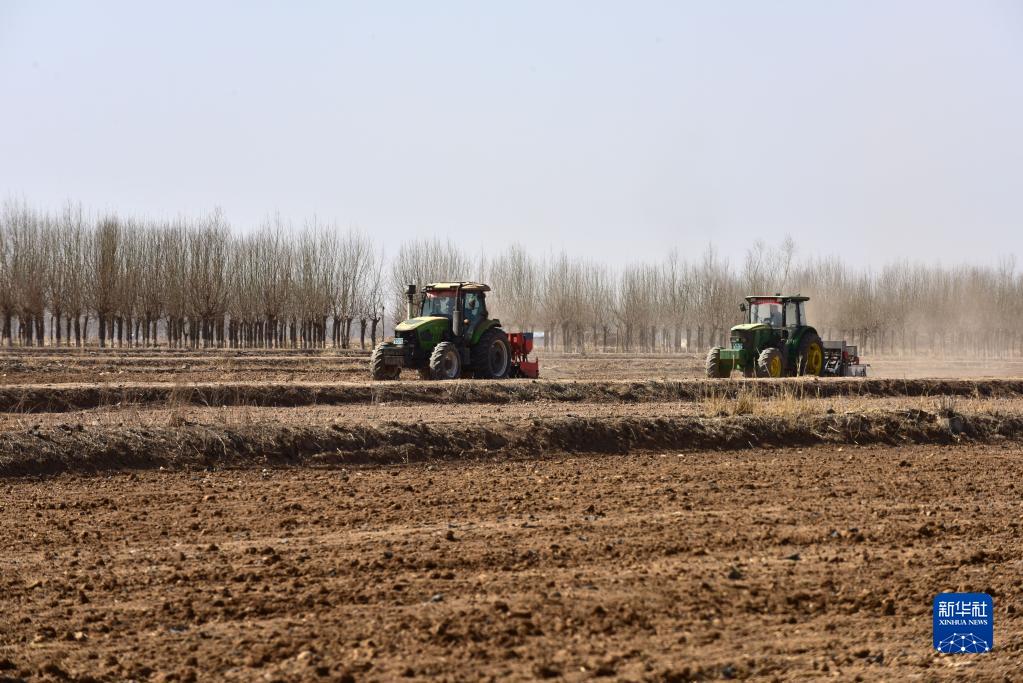 在宁夏银川市贺兰县立岗镇兰星村,农民驾驶农机播种春小麦(2023年3月3日摄)。新华社记者李旭伦摄